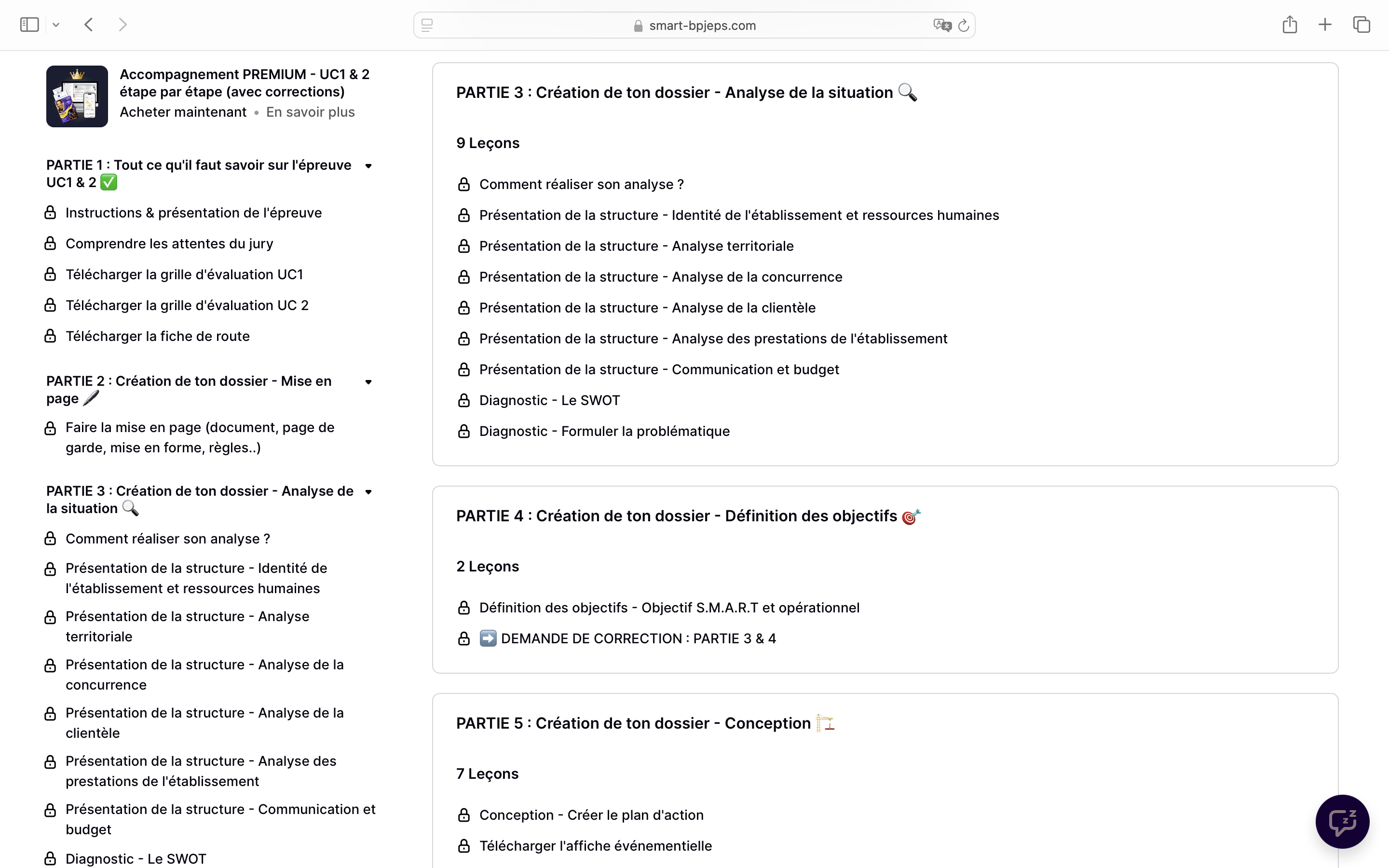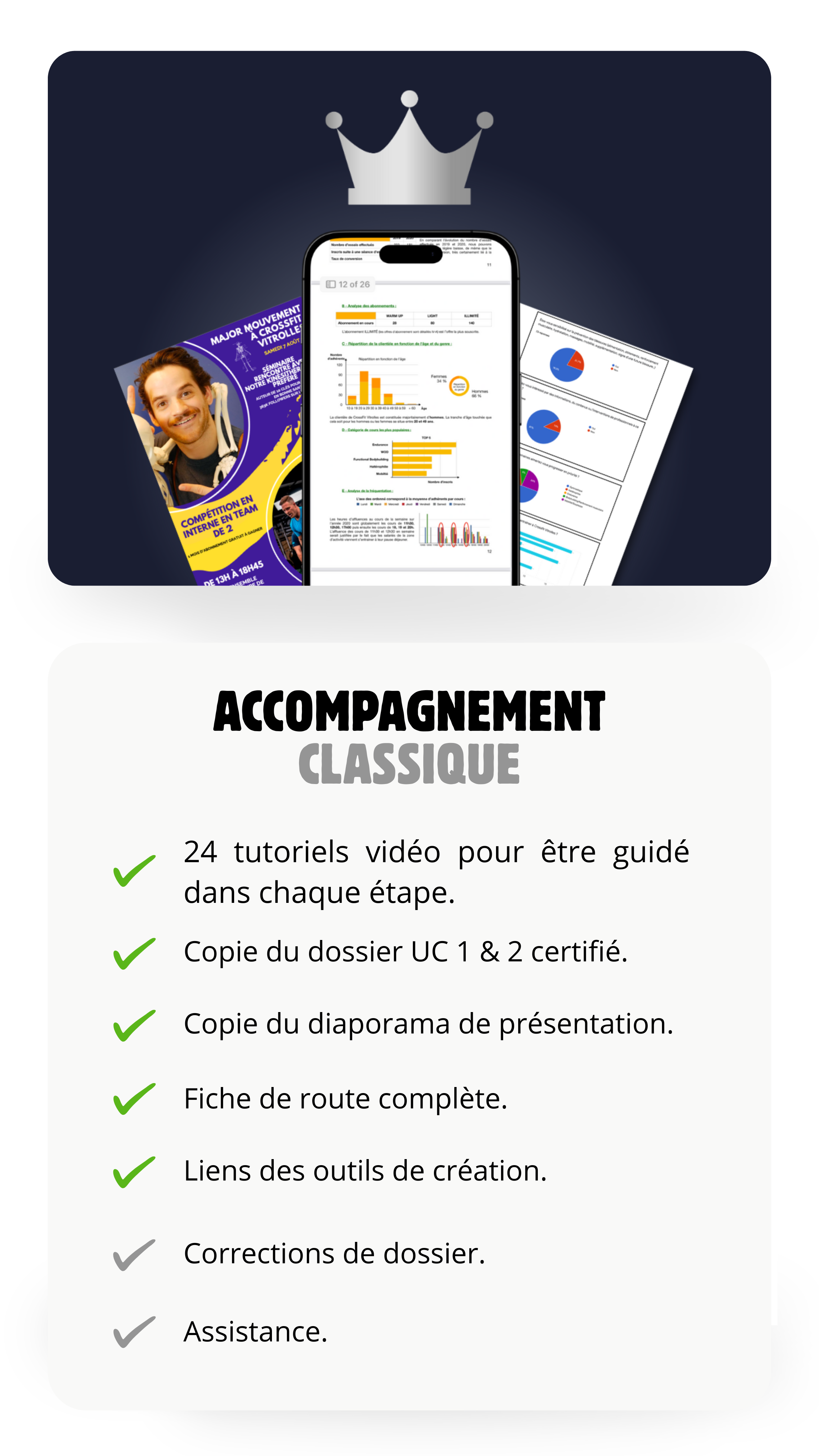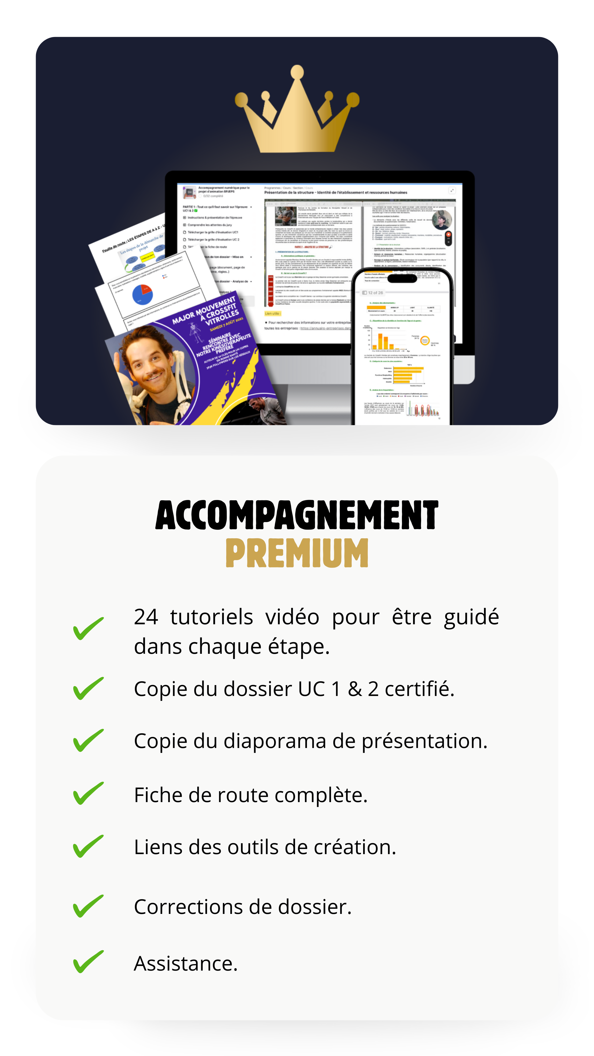 Cet accompagnement inclut un dossier UC 1 & 2 complet et certifié, une série de 24 vidéos explicatives, une feuille de route complÚte, et des outils concrets pour te guider étape par étape.